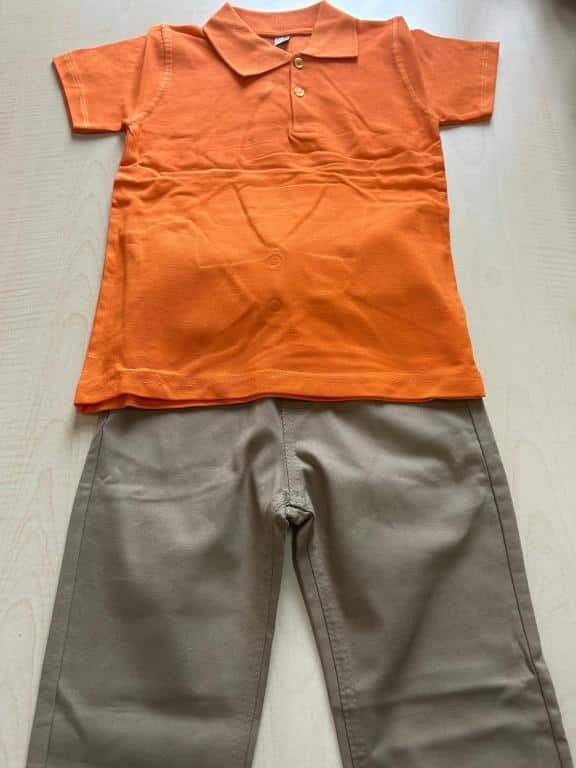 6-Okul kıyafeti olarak üst giyim; turuncu (kısa ve uzun kollu) tişört ve sweatshirt olarak, alt giyim olarak; bej pantolon-etek belirlenmiştir.10/07/2025